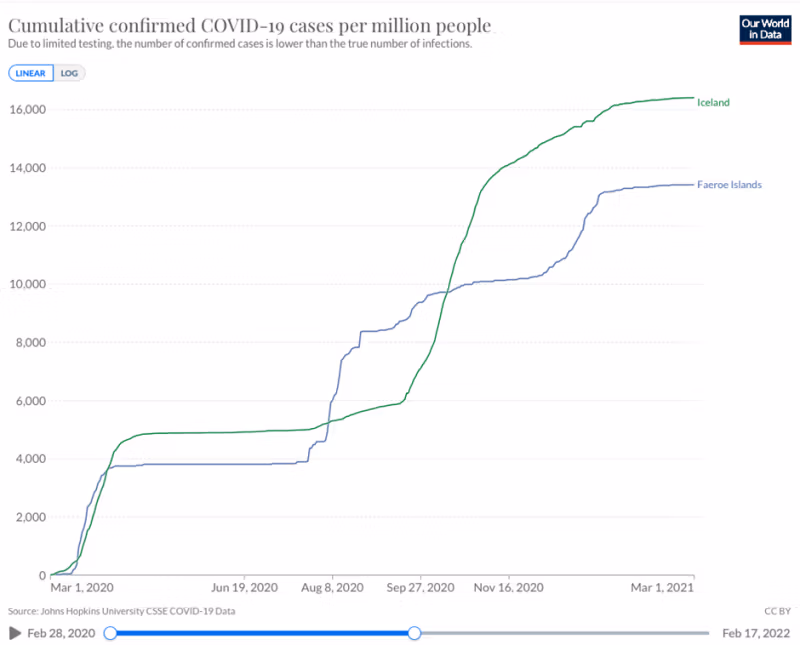 Infekcijas pirmajā COVID-19 gadā Fēru salās un Islandē (OWID)